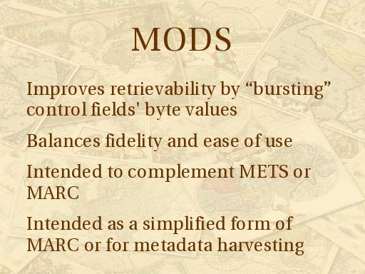 On the MODS' website, its creators suggest this compromise may be benficial to those libraries looking for an extension schema to supplement the METS standard, those interested in making their metadata available for harvesting, or for those wanting to represent simplified MARC data in XML.
