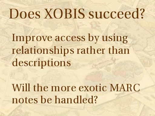 While we believe the structure is sound, we have not explored some of the more complex, exotic MARC note fields. Still, in developing XOBIS, we worked from the assumption that any note with a multitude of subfields should be expressed as a relationship. Whether some MARC notes embed more than one relationship within a single MARC field remains to be seen.