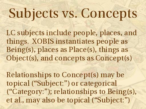 The most obvious example of this is with Concepts. It is important to keep in mind that XOBIS' Concepts will not match LC's subject headings.