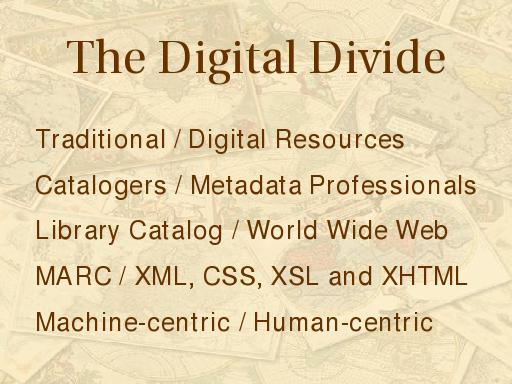 Often the digital divide, like XML, is oversold. Despite the frenzied hype that is associated with XML, and the digital divide, there are substantive issues that need to be addressed. In the world of librarianship, the digital divide to which I'm referring has several characteristics.