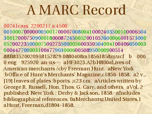Though you have probably seen a display MARC record, on this slide I've reproduced a real MARC record. Keep in mind that MARC records do not have end of line characters; line wrapping is something I've added. I've also color coordinated the record to make it easier to read.